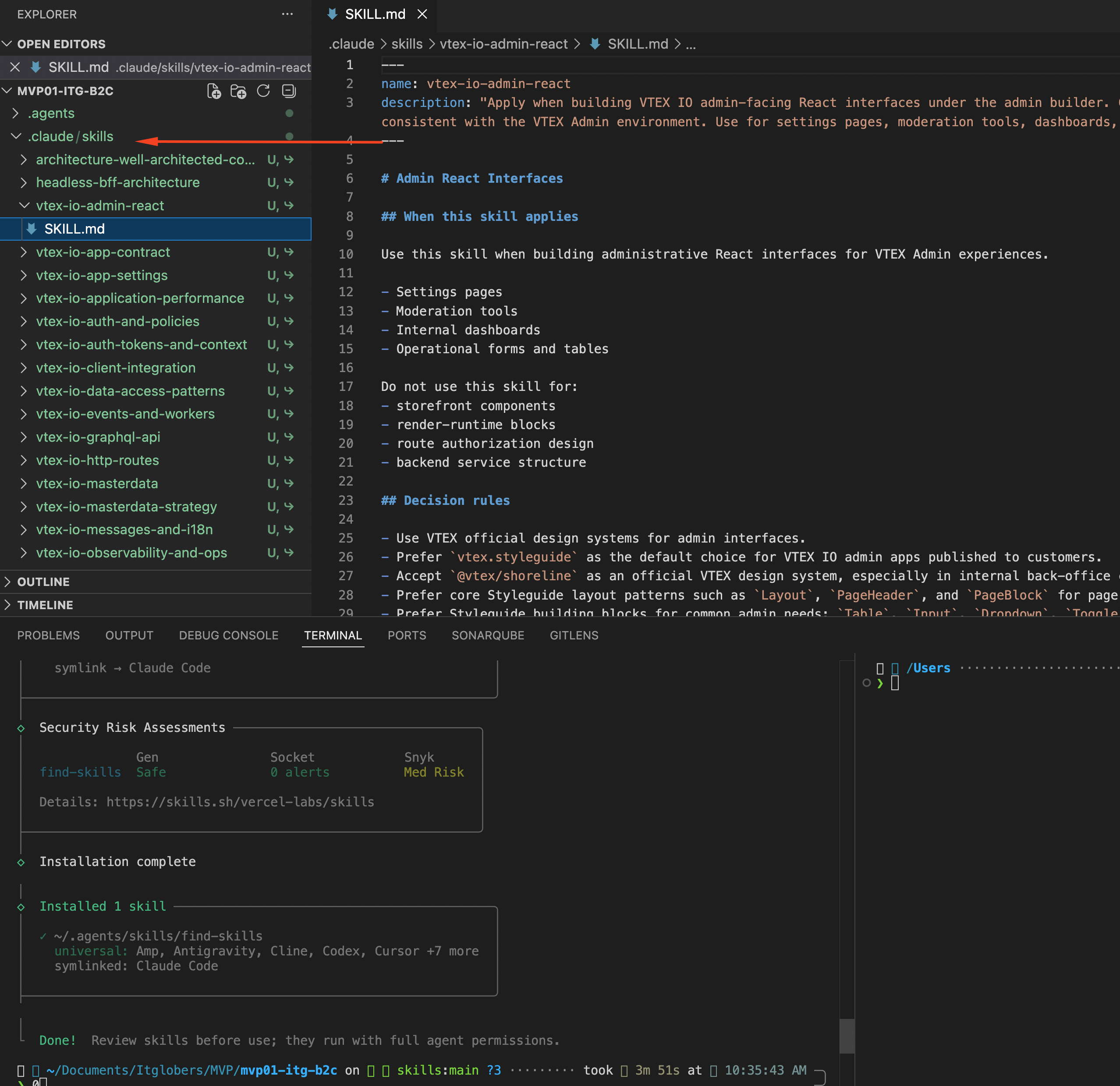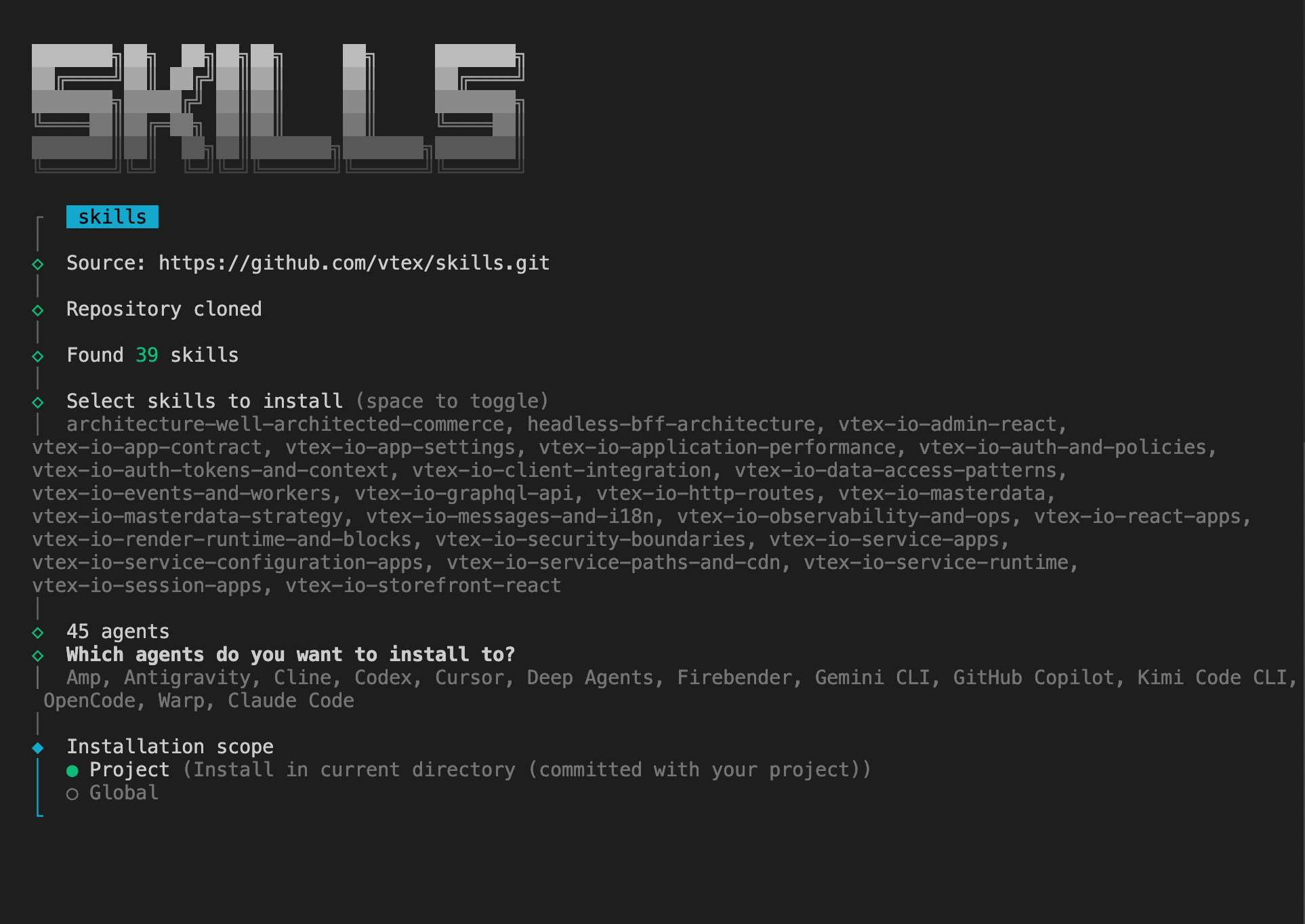npx skills add vtex/skills --all. Súbelas al proceso de setup del equipo. - El