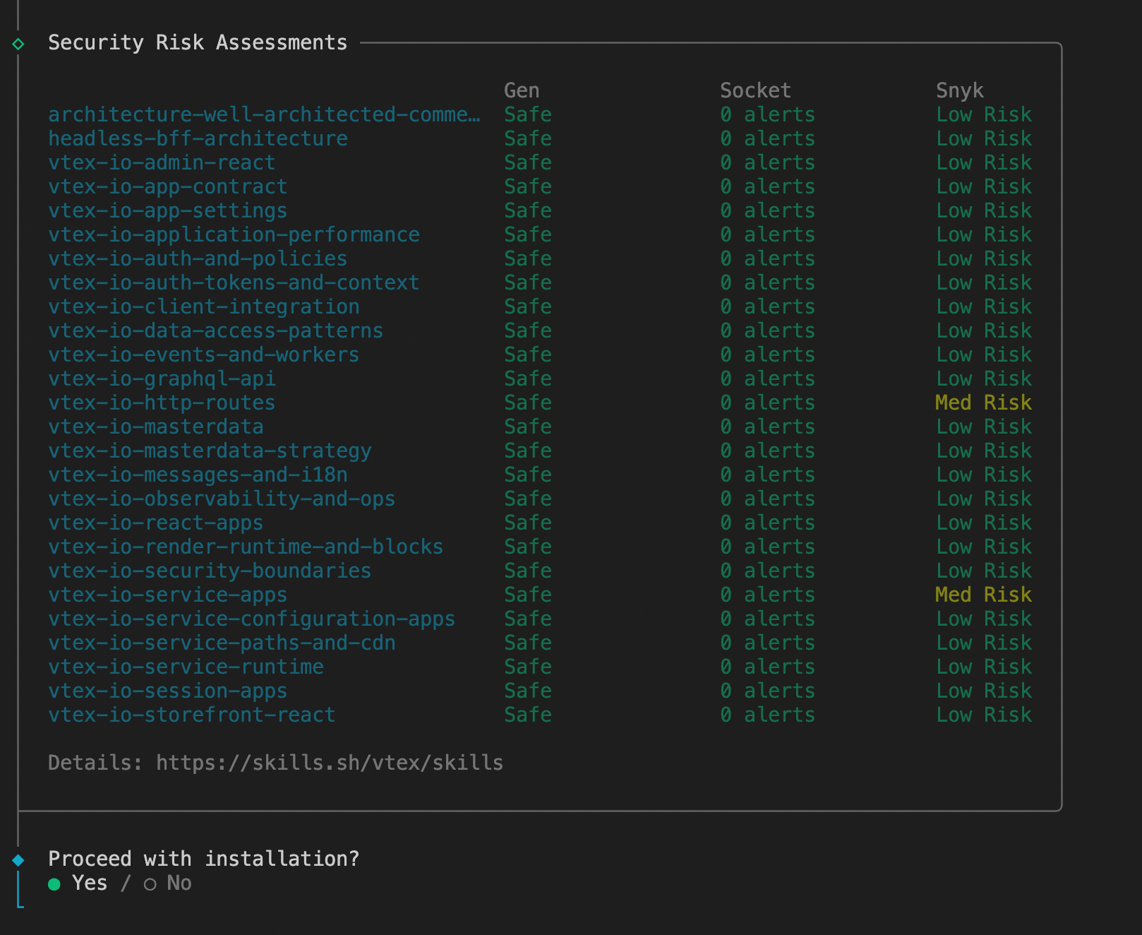 Security Risk Assessment: Antes de proceder, el CLI audita cada skill con tres herramientas (Gen, Socket, Snyk) y muestra el resultado. Todas las skills califican como Safe con 0 alerts. Dos skills (vtex-io-http-routes y vtex-io-service-apps) tienen clasificación Med Risk en Snyk — esto es por patrones de rutas HTTP, no por código malicioso: