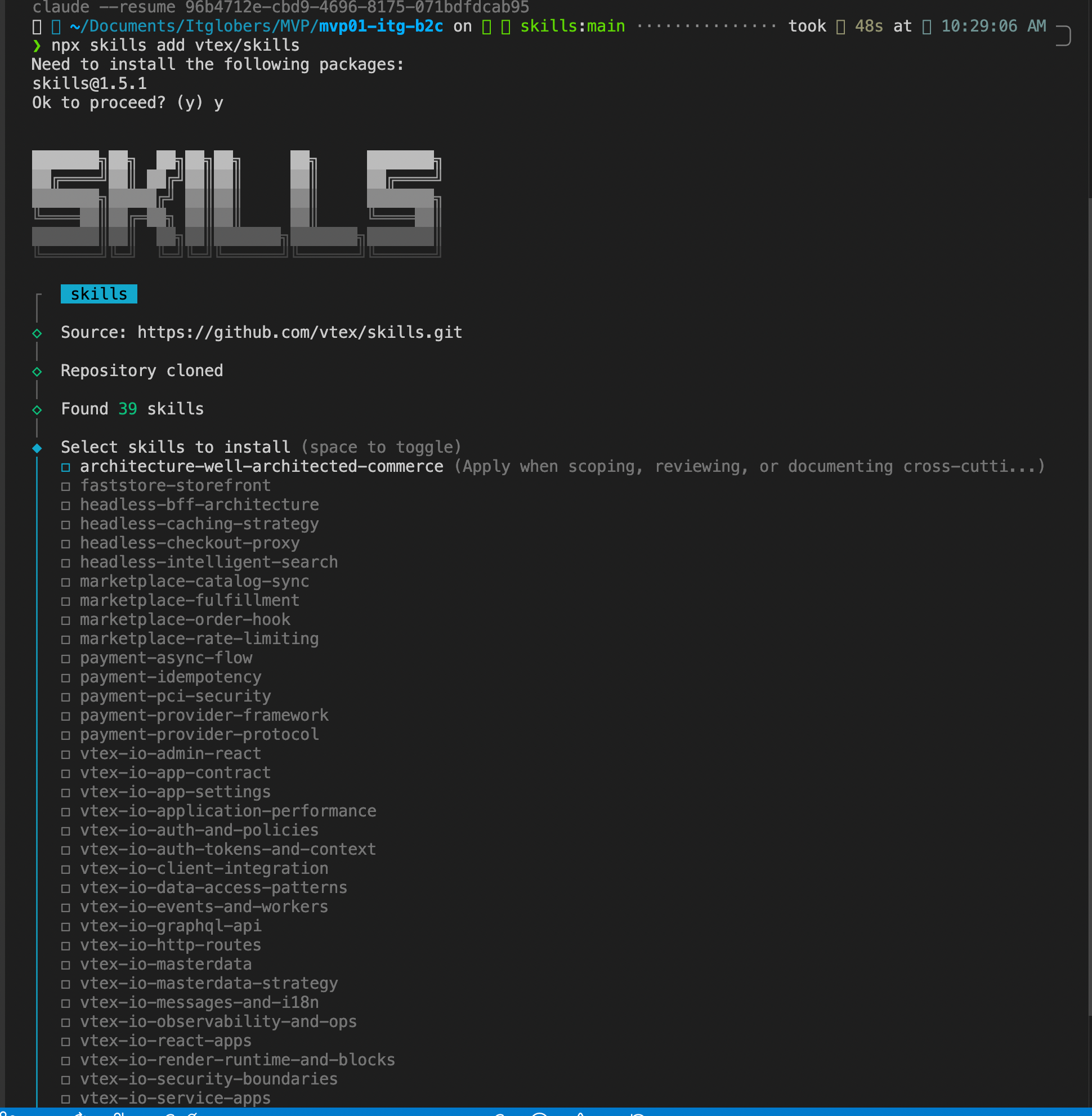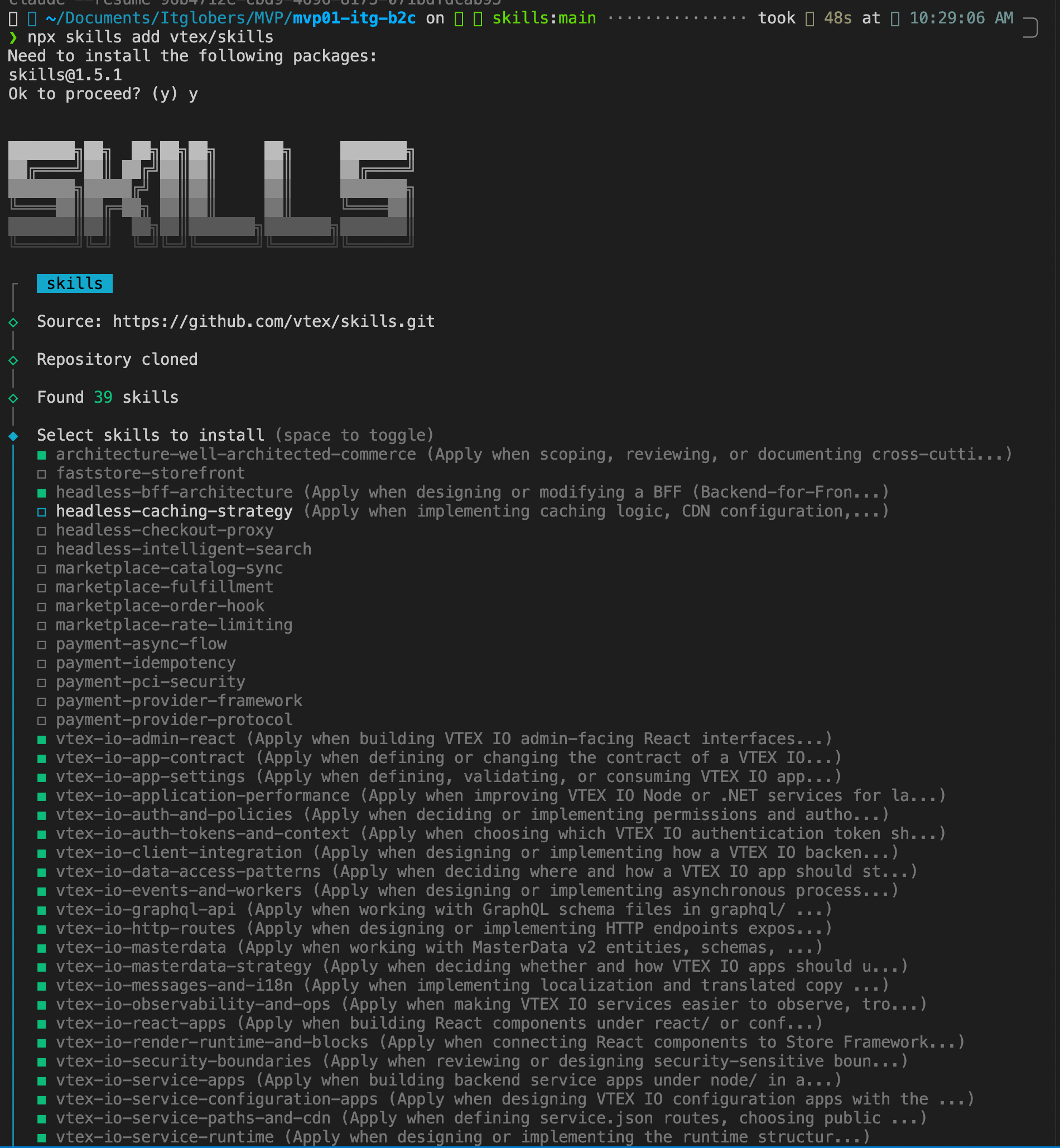 El CLI descarga el repositorio de skills desde https://github.com/vtex/skills.git, encuentra las 39 skills disponibles y arranca el proceso de selección interactivo: