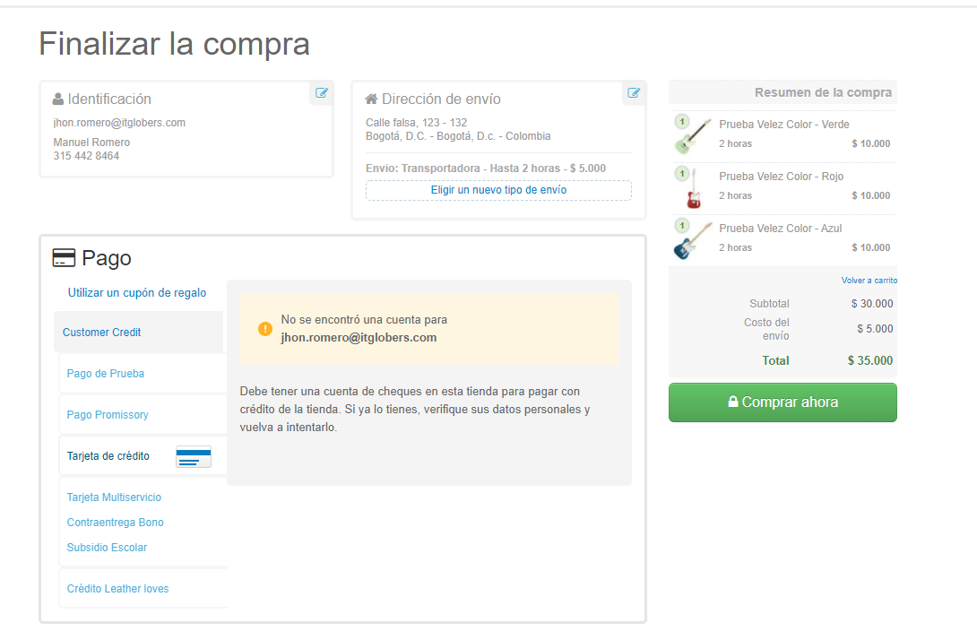 Este seria el carrito de compras sin la promoción aplicada. Tenemos un total de compra por 30.000 y un envió de 5.000.