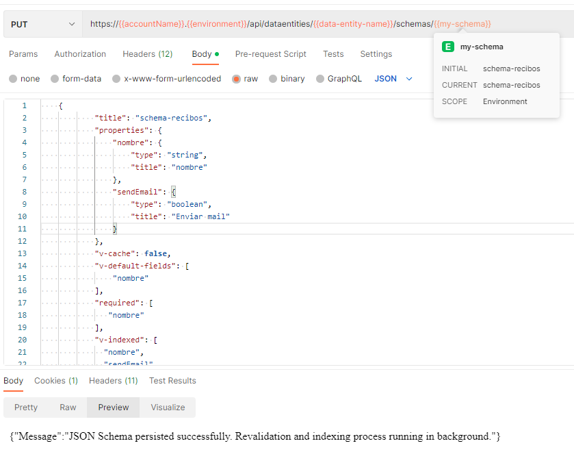 https://{{accountName}}.{{environment}}/api/dataentities/{{data-entity-name}}/schemas/{{my-schema}}Donde {{data-entity-name}} es el nombre de la entidad anteriormente creada y {{my-schema}} es el nombre de nuestro schema.